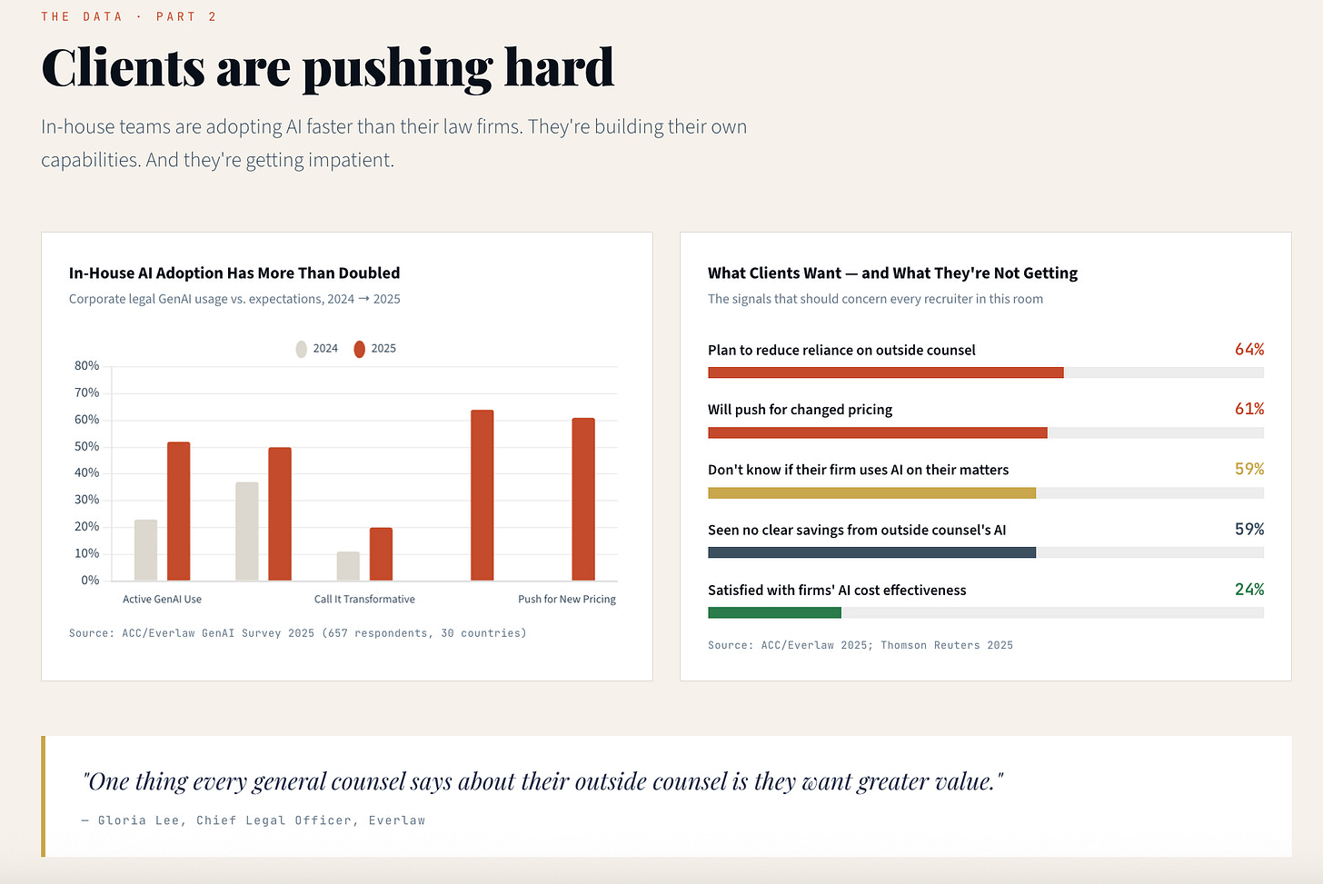 Death by PowerPoint is optional. One of the most unexpectedly delightful experiments I’ve been running is using AI (Claude Code) to build interactive HTML dashboards in place of slide decks — and I’m not going back. The process is simpler than it sounds: share your data, describe what you want to communicate, and let the AI generate a clean, dynamic, visually compelling dashboard you can present live and hand off as a takeaway. No design skills required. At a recent presentation to legal recruiters and professional development leaders, for example, I used a dashboard to explore AI’s impact on the law firm business model and what it could mean for hiring — the kind of nuanced, data-rich conversation that slide bullets simply can’t hold. Attendees could see relationships between data points at a glance, and they walked away with something they could actually use, not just a PDF of slides. For anyone presenting research, survey results, or emerging trends, this is worth experimenting with. The barrier to entry is low, and the payoff — for you and your audience — is real.