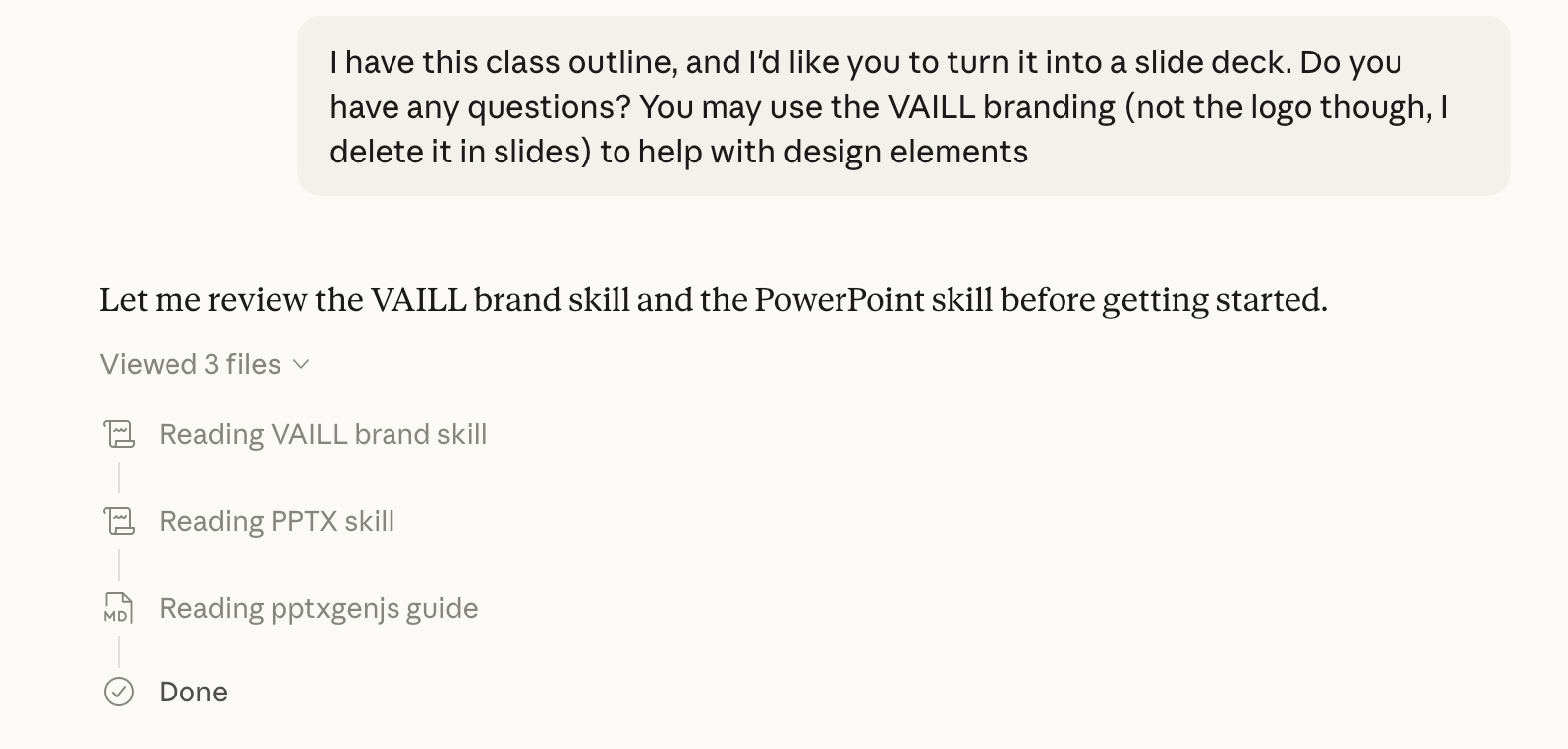 I’ve been using custom instructions in Claude across several workflows this year: building a slide deck template for my AI-Augmented Legal Research course so each week’s presentation stays visually cohesive, creating a processing system for monthly library statistics that I can trigger with a single sentence, and establishing brand guidelines for VAILL so that any content I generate, from LinkedIn posts to course handouts, stays on-voice.